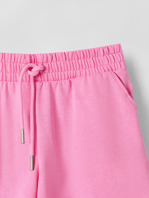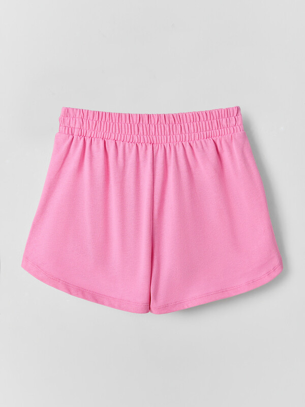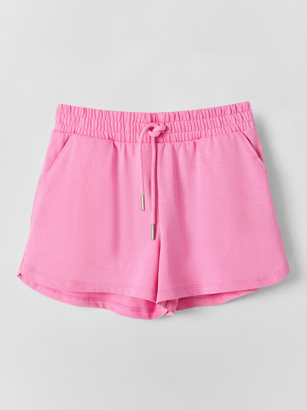 Шорты свободного силуэта. Пояс цельнокроенный с эластичной тесьмой внутри 40RV, по переду пробиты петли и втянут 8NMKXWC-1 шнур с наконечником . На передних деталях карманы с отрезным бочком, отстрочены. Низ изделия с фигурным разрезом по бокам.