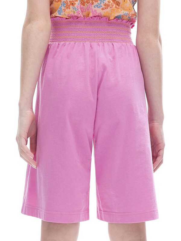 Шорты-бермуды из 100% хлопка для девочки. Натуральный состав ткани и свободный крой обеспечивают комфорт вашему ребёнку. Изделие приятное на ощупь и отлично подходит для жаркой погоды. Пояс модели украшает горизонтальная сборка контрастными нитками с деликатным рюшем вверху — актуальный летний тренд. Такие шорты будут носиться долго. Ребёнок растёт, и они словно "растут" вместе с ним. Однотонные яркие бермуды легко сочетать с топами и футболками различных силуэтов и расцветок.