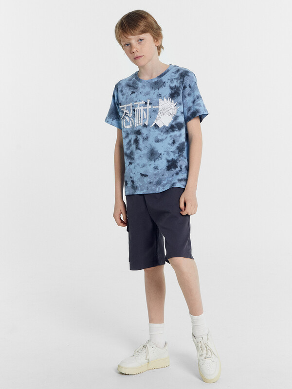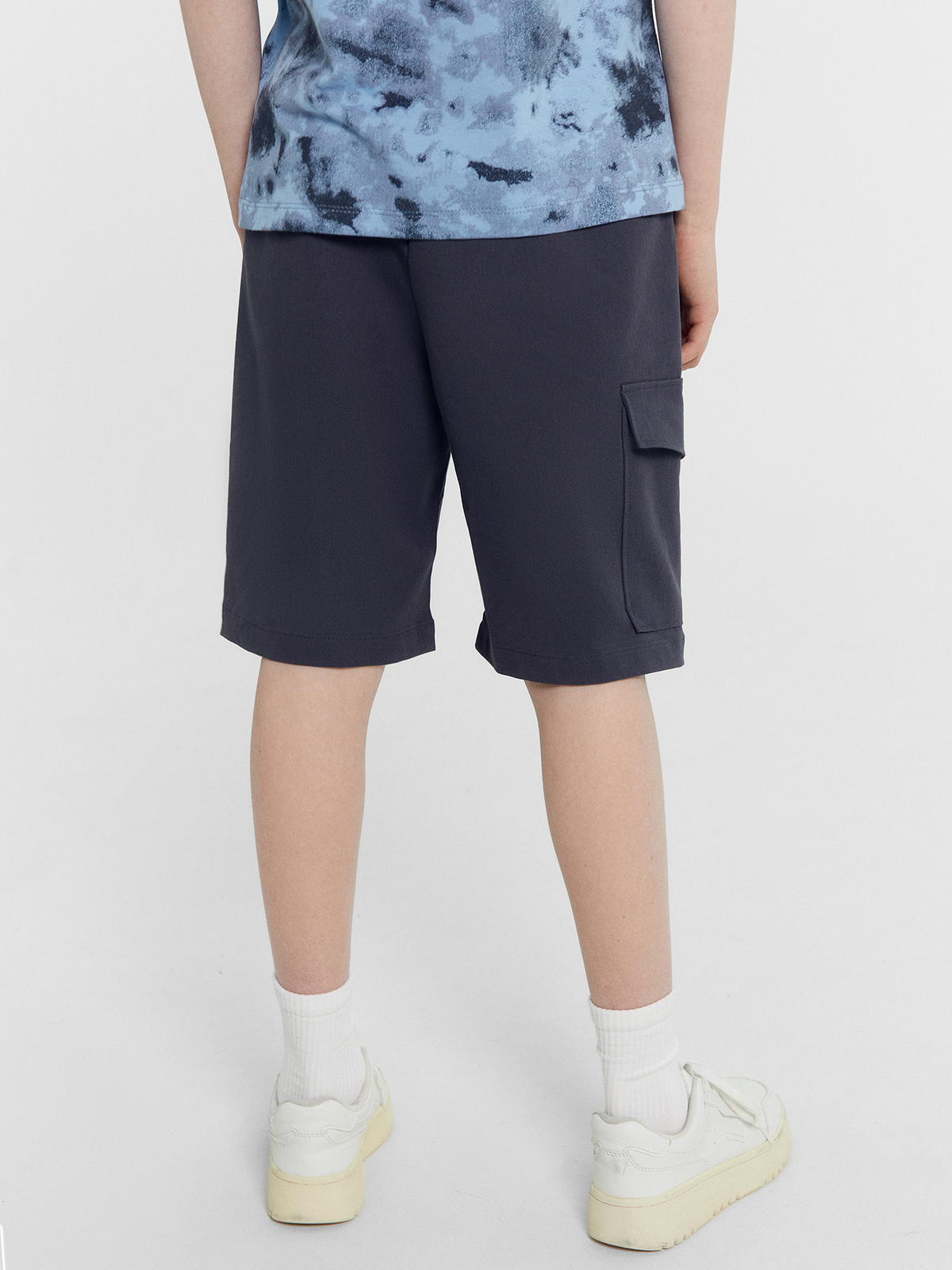 Шорты карго прямого силуэта из текстильного полотна. Посадка средняя. Длина выше колена. Пояс цельнокроеный с эластичной тесьмой и шнуром внутри. По поясу выполнены три декоративные строчки. На передних деталях брюк настрочен один карман с клапаном, обработаны карманы с наклонным входом от боковых швов. Низ изделия обработан швом в подгибку.