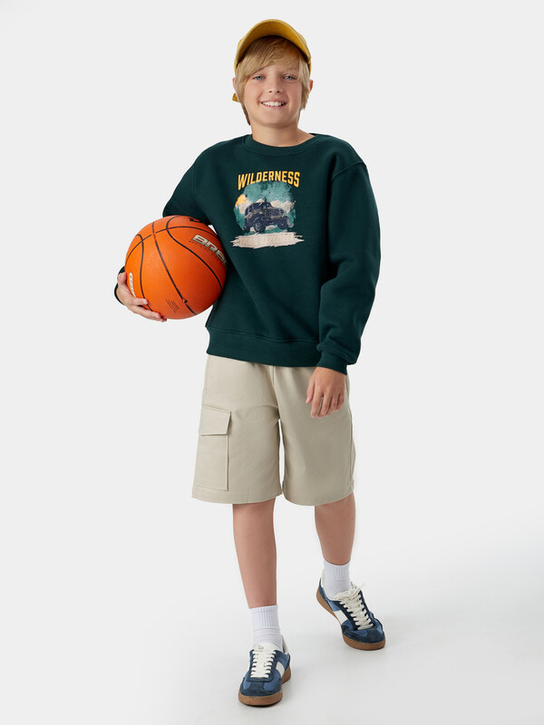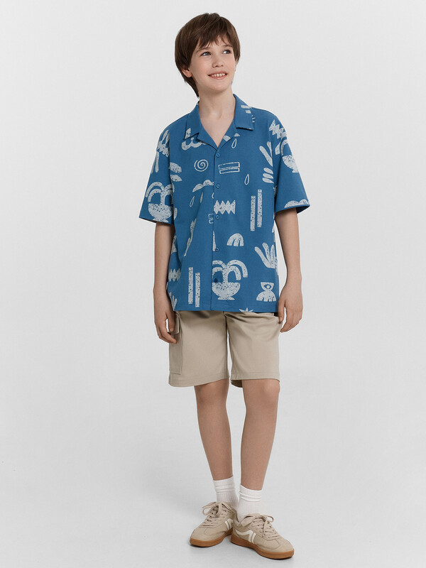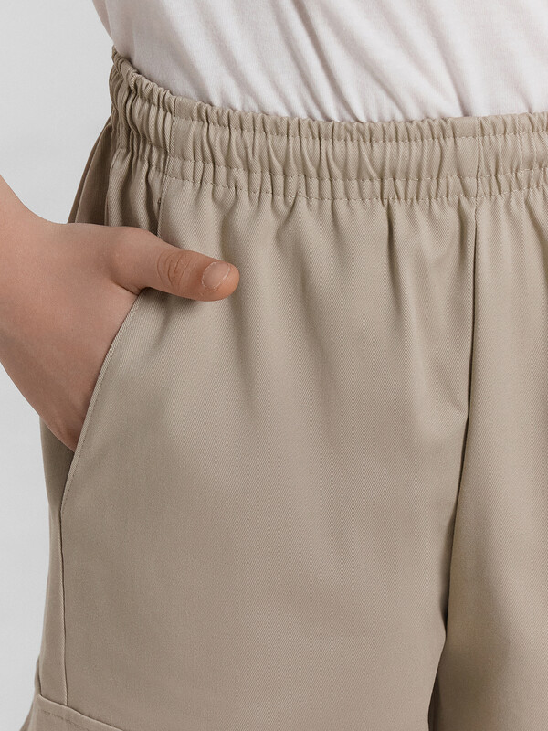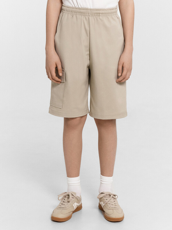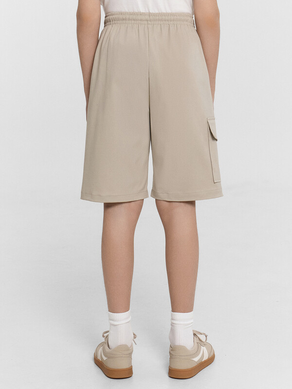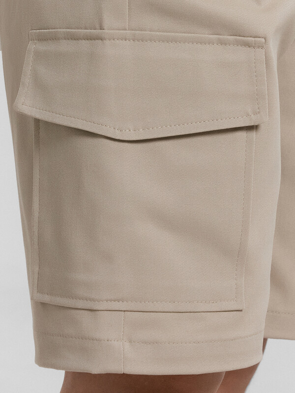 Шорты карго прямого силуэта из текстильного полотна. Посадка средняя. Длина выше колена. Пояс цельнокроеный с эластичной тесьмой и шнуром внутри. По поясу выполнены три декоративные строчки. На передних деталях брюк настрочен один карман с клапаном, обработаны карманы с наклонным входом от боковых швов. Низ изделия обработан швом в подгибку.