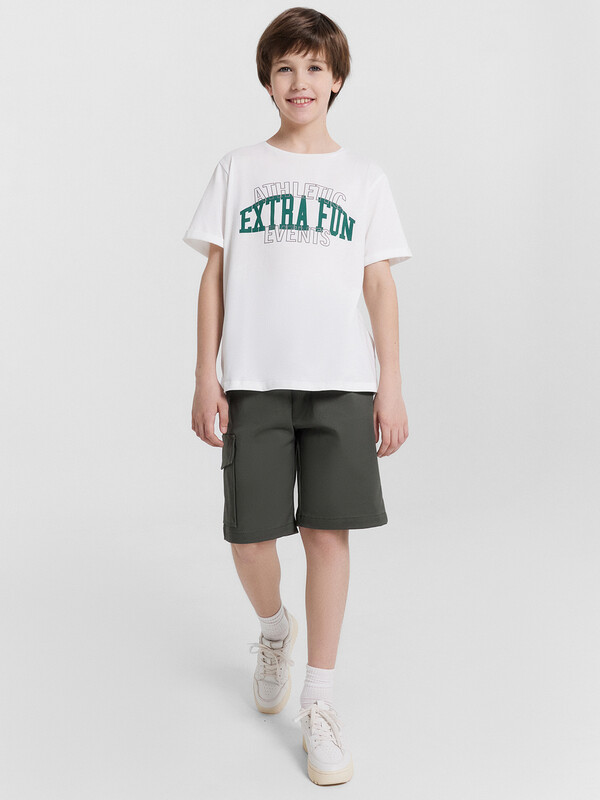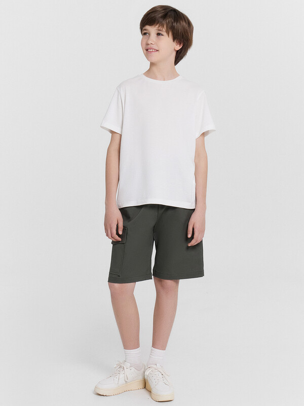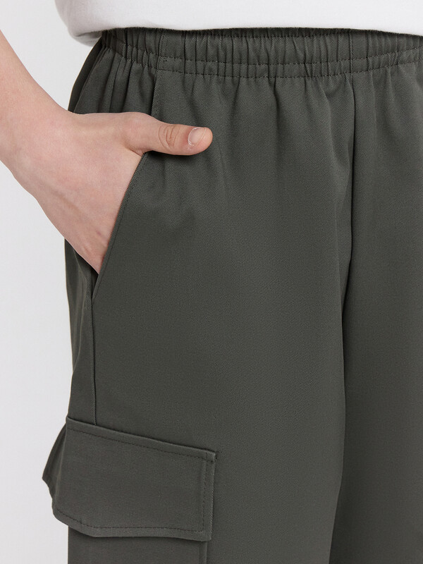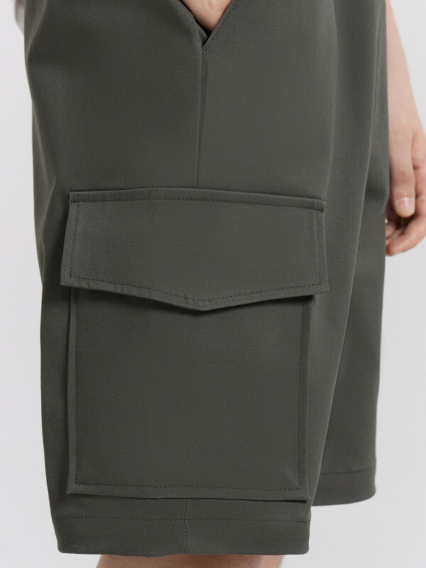 Шорты карго прямого силуэта из текстильного полотна. Посадка средняя. Длина выше колена. Пояс цельнокроеный с эластичной тесьмой и шнуром внутри. По поясу выполнены три декоративные строчки. На передних деталях брюк настрочен один карман с клапаном, обработаны карманы с наклонным входом от боковых швов. Низ изделия обработан швом в подгибку.