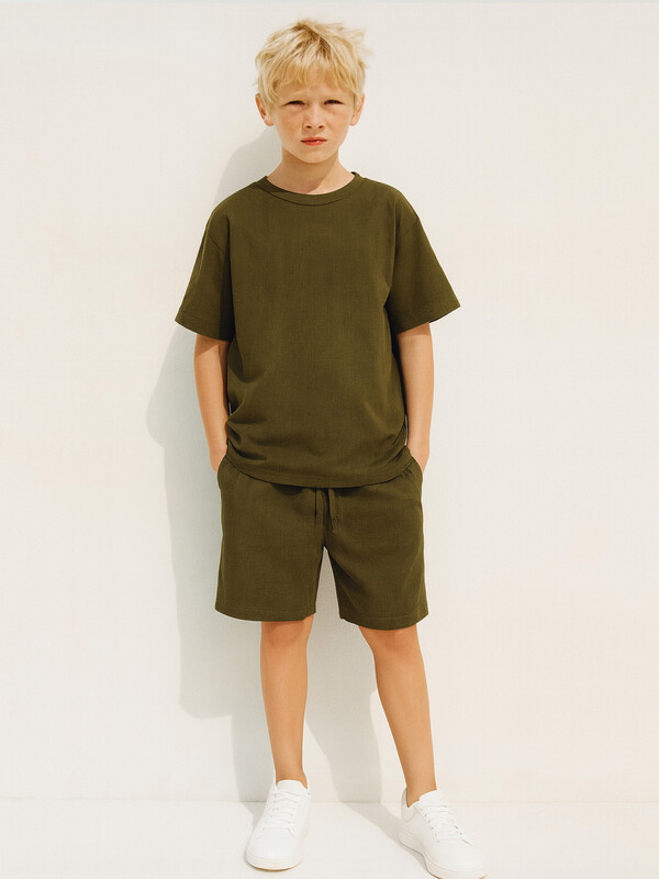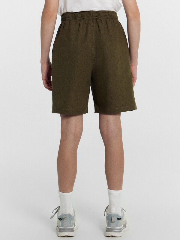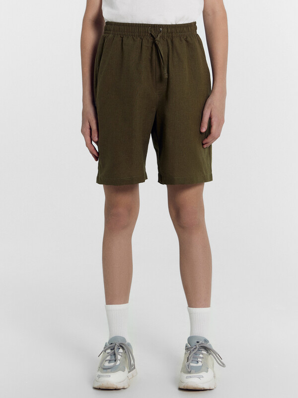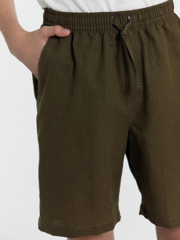Шорты прямого силуэта. Посадка средняя. Пояс цельнокроеный с эластичной тесьмой внутри. Шов сидения шорт распошит. На поясе пробиты петли, заправлен шнур из основного полотна. По переду имитация гульфика, обработаны карманы с наклонным входом от боковых швов. Низ шорт