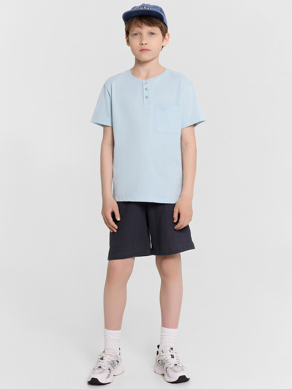Шорты для мальчиков из ткани (муслин). Шорты с классической линией талии. Силуэт прямой. Пояс цельнокроеный. Верхний срез шорт застрочен с эластичной тесьмой. Карманы в боковых швах (хулиганы). На внешней стороне пояса пробиты петли, втянут шнур из основного полотна. Низ шорт обработан швом в подгибку.