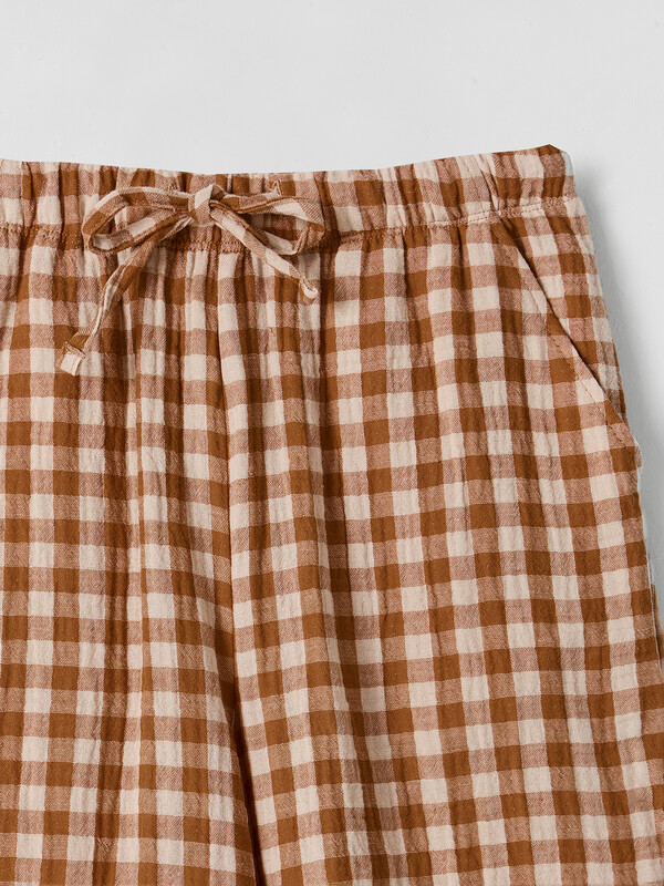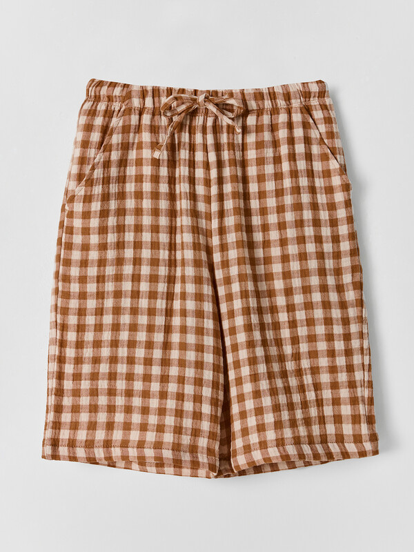 Шорты для мальчиков из ткани (муслин). Шорты с классической линией талии. Силуэт прямой. Пояс цельнокроеный. Верхний срез шорт застрочен с эластичной тесьмой. Карманы в боковых швах (хулиганы). На внешней стороне пояса пробиты петли, втянут шнур из основного полотна. Низ шорт обработан швом в подгибку.