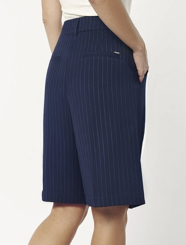 Шорты-бермуды выполнены из костюмной ткани в полоску. Модель свободного кроя дополнена боковыми и задними карманами. Изделие не сковывает движений и подходит для любого типа фигуры. Сочетается в костюме с жилетом D27.001