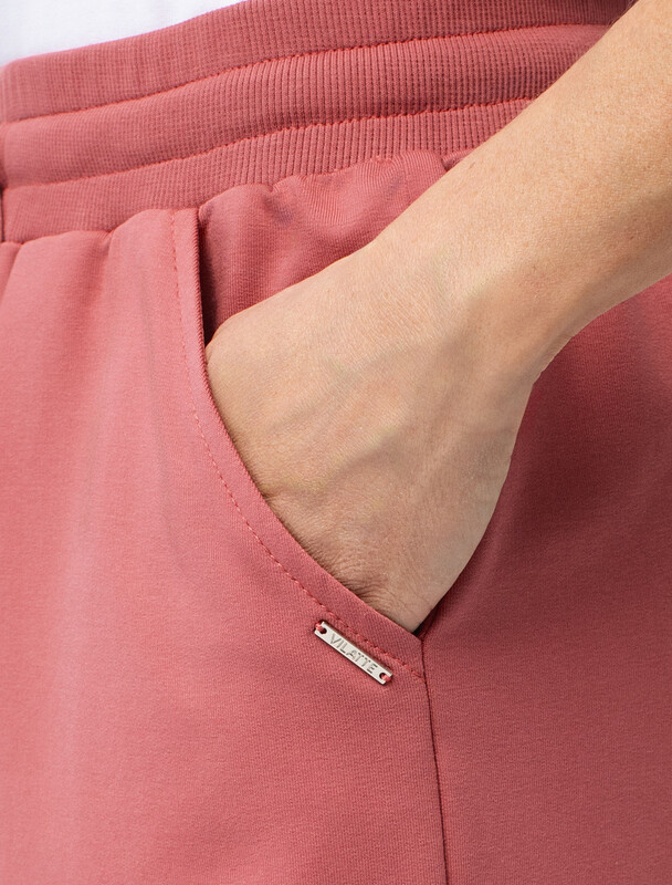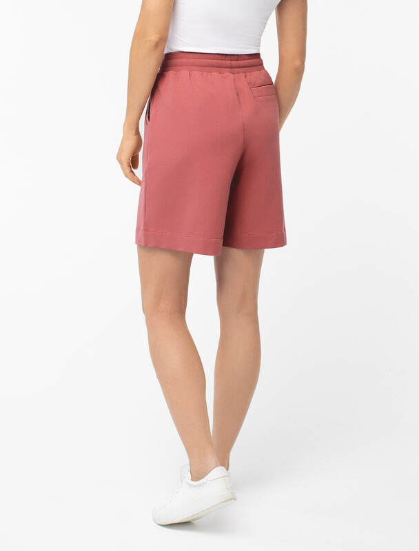 Шорты выполнены из футера двухнитки с эластаном. Модель прямого кроя дополнена боковыми карманами и одним задним карманом. Пояс выполнен из эластичного трикотажа в рубчик. В пояс вставлен плоский хлопковый шнур в тон изделия с серебристыми наконечниками. Изделие дополнено металлическим логотипом бренда. Сочетается в костюме с жакетом D49.078, джемпером D49.079, D49.080 и футболкой D49.081