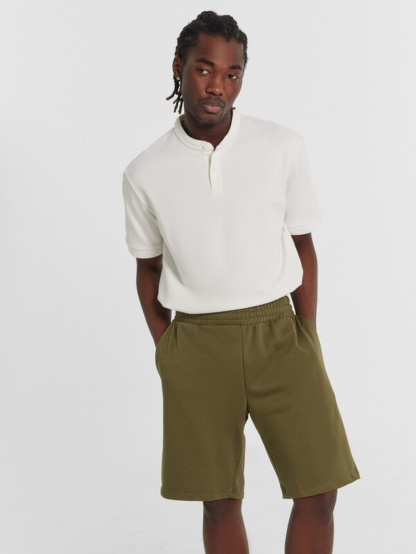Шорты мужские прямого силуэта из трикотажного полотна футер. Пояс отрезной из основного полотна с эластичной тесьмой внутри. По поясу проложены отделочные строчки. По внутренней части пояса втавлен кругловязаный шнур. В боковых швах обработаны карманы с отрезным бочком, подкладка карманов кулирка.