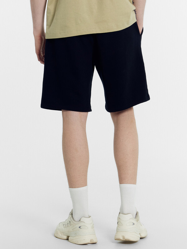Шорты мужские прямого силуэта из трикотажного полотна футер. Пояс отрезной из основного полотна с эластичной тесьмой внутри. По поясу проложены отделочные строчки. По внутренней части пояса втавлен кругловязаный шнур. В боковых швах обработаны карманы с отрезным бочком, подкладка карманов кулирка.
