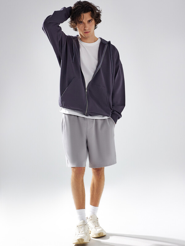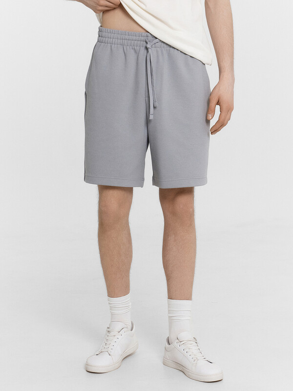 Шорты прямые, посадка средняя. Пояс цельнокроёный с эластичной тесьмой внутри. По переду пробиты петли и втянут шнур с застроченными концами. На левой детали переда имитация гульфика. По переду карманы с отрезными бочками. Нижние срезы шорт обработаны швом вподгибку.