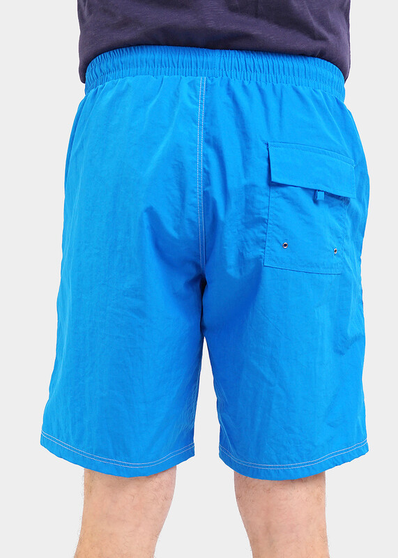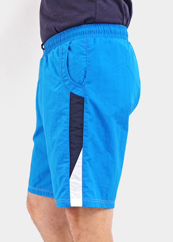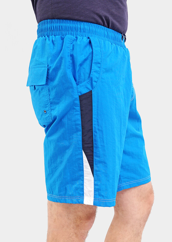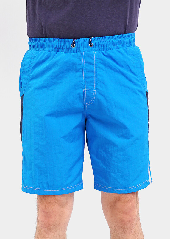 Модные пляжные шорты комфортной посадки из быстросохнущего полотна с контрастными вставками. Изделие дополнено декоративным гульфиком и лаконичным принтом по карману.