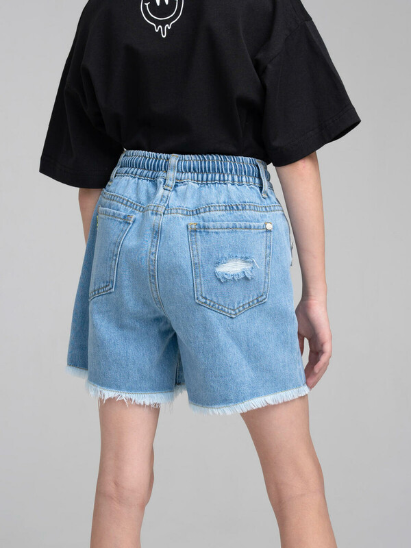 Джинсовые шорты для девочки подростка. Шорты свободного силуэта на резинке со шнурком. Функциональные карманы. Трендовые элементы потертости и дыры. Неподшитый низ.