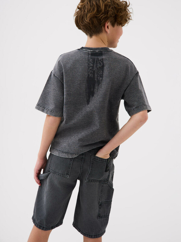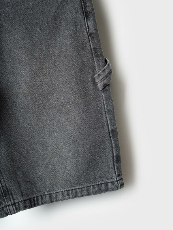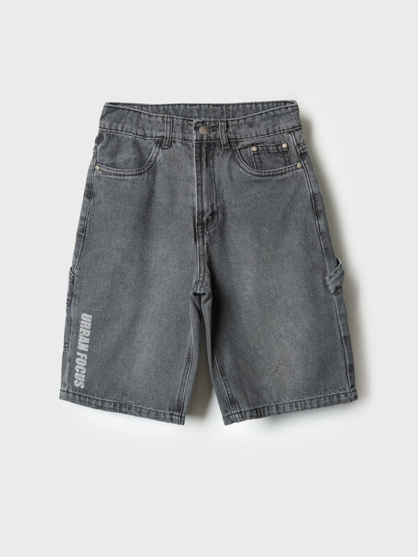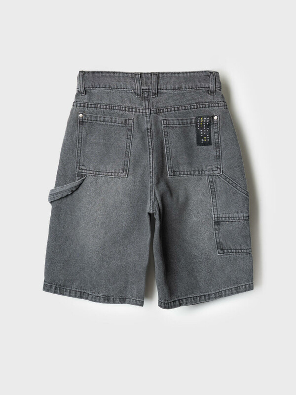 Джинсовые шорты свободного кроя, ниже колена для мальчика подростка. Они выполнены из плотного денима и дополнены множеством практичных деталей: классические передние карманы, задние накладные карманы и дополнительный карго-карман сбоку. Пояс регулируется при помощи внутренней резинки с пуговицей, а в качестве застёжки используется болт и молния. Шорты смотрятся современно и удобно сидят за счёт прямого силуэта и проработанных деталей.