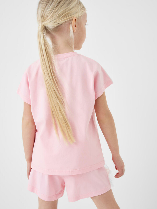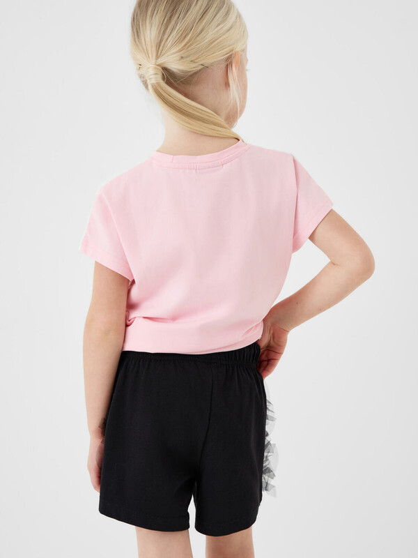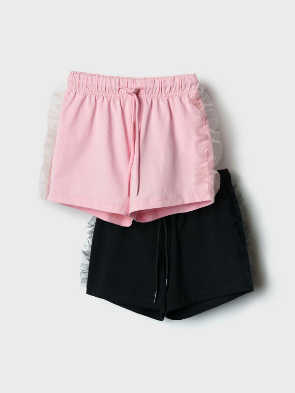 Набор шорт для девочки подростка. В комплект входят две пары шорт свободного кроя, в длине мини. Модели из мягкого, хлопкового трикотажа джерси. Удобная посадка обеспечивается эластичным поясом со шнуром. Декор из сетки по бокам.