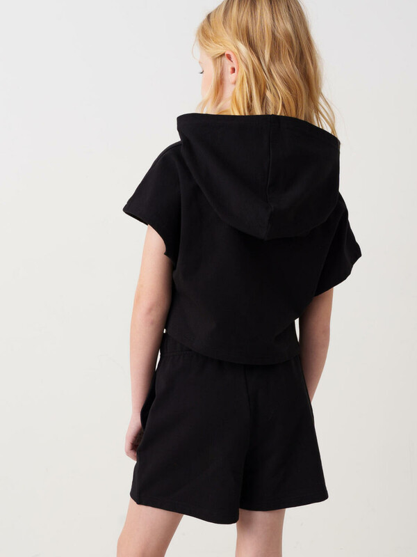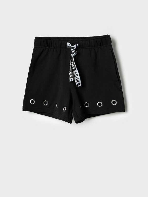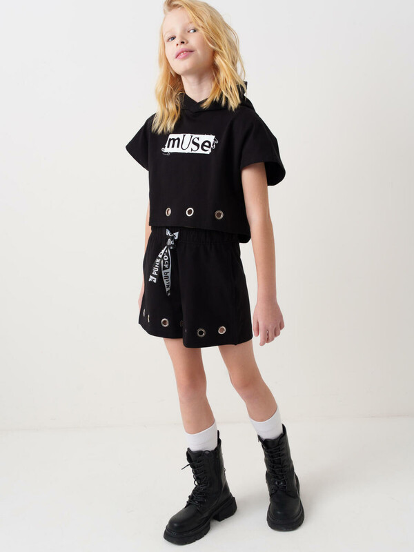 Шорты для девочки подростка. Модель свободного кроя из мягкого, хлопкового трикотажа футер. Удобная посадка обеспечивается эластичным поясом со шнуром. В боковых швах расположены удобные внутренние карманы. Внизу шорт предусмотрена декоративная отделка в виде металлических люверсов.