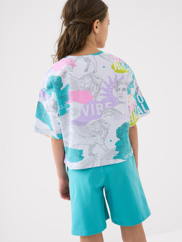 Шорты для девочки подростка. Модель свободного кроя из мягкого, хлопкового трикотажа футер. Удобная посадка обеспечивается эластичным поясом со шнуром. Спереди — боковые карманы и декоративная нашивка.