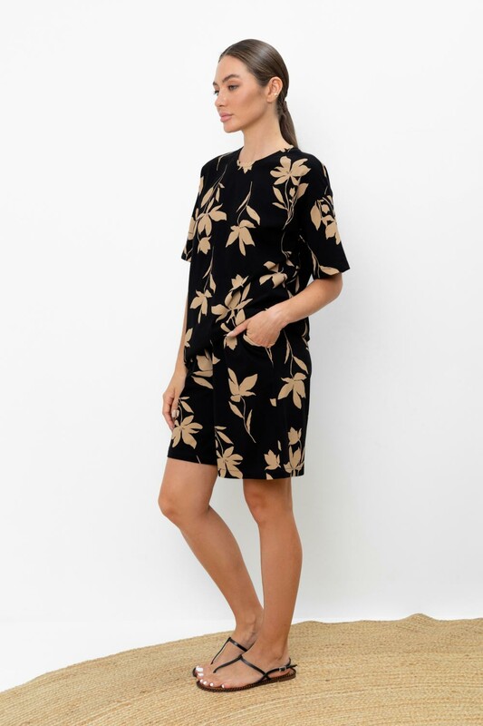 Женские шорты на резинке с удобными карманами из набивного трикотажа супрем. Низ обработан плоскими швами.