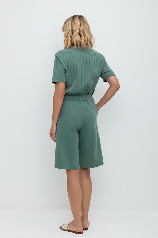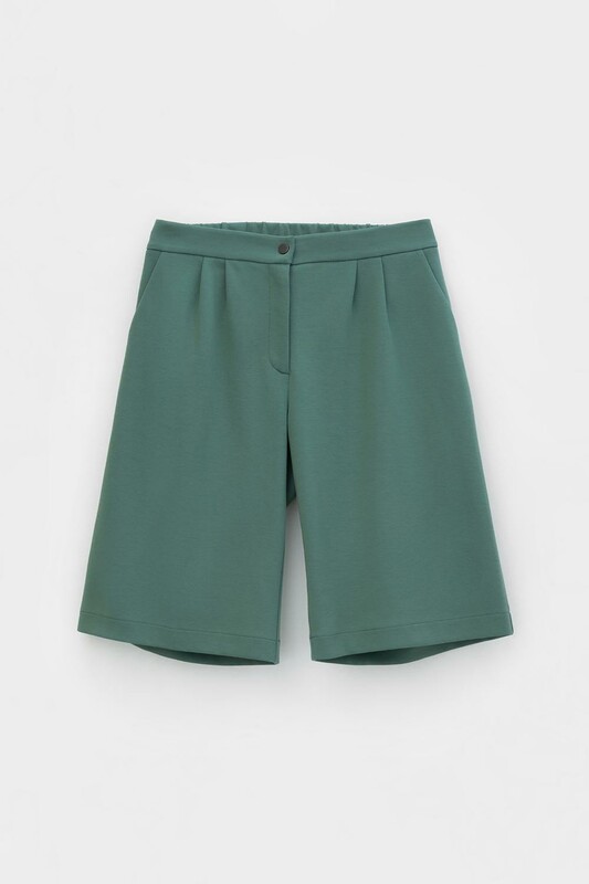 Женские шорты со складками и удобными карманами из плотного набивного трикотажа интерлок. Низ обработан плоскими швами.