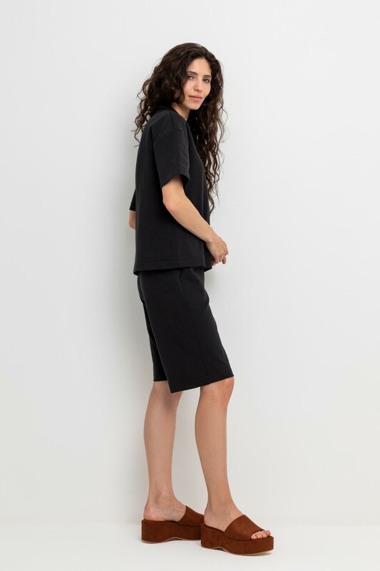 Удлиненные женские шорты из плотного гладкого трикотажа интерлок с удобными боковыми карманами и застежкой на молнию и кнопку. Низ обработан плоскими швами.