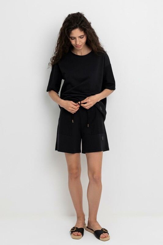 Женские шорты из футера на резинке с удобными карманами наизнанку. Пояс утягивается по ширине круглым шнуром. Низ обработан плоскими швами.