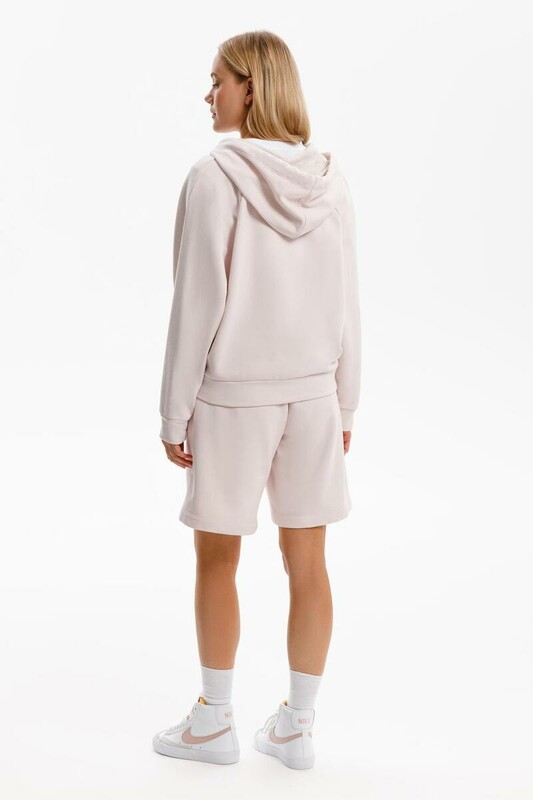 Удлиненные шорты спортивного силуэта из мягкого двухцветного футера. Внутренняя сторона изделия представлена в натуральном цвете хлопка, внешняя в нежно-розовом. За счет использования крашенной пряжи, данный вид полотна прошел минимальную обработку, что придало изделию мягкость и шелковистость.
