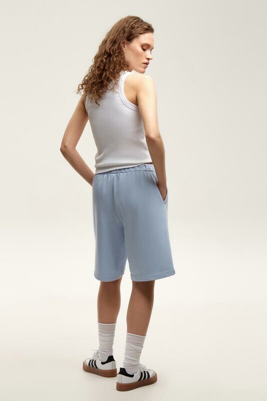 Удлиненные шорты спортивного силуэта из мягкого двухцветного футера. Внутренняя сторона изделия представлена в натуральном цвете хлопка, внешняя в нежно-голубом. За счет использования крашенной пряжи, данный вид полотна прошел минимальную обработку, что придало изделию мягкость и шелковистость.
