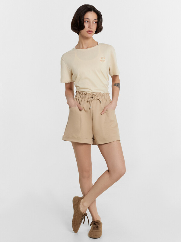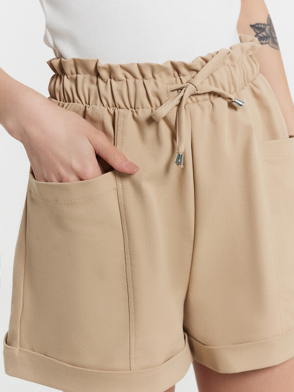 Стильные шорты свободного силуэта, чуть расширенного к низу. Выполнены из нежного текстиля, в основе которого хлопок. Линия талии завышена. Передняя часть шортов украшена рельефными швами и функциональными накладными карманами. Пояс с эластичной тесьмой внутри, регулировочным шнурком-завязкой и рюшей по верхнему краю. Рекомендуем!
