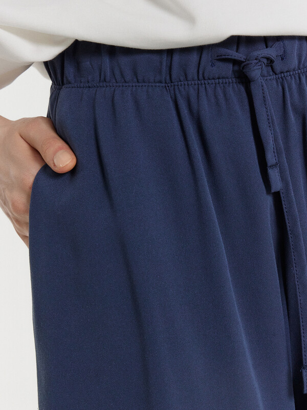 Шорты женские свободного силуэта из ткани. На детали переда карманы с отрезным бочком.
