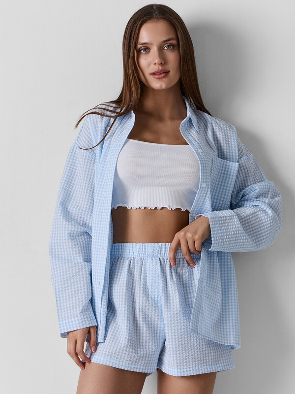 Шорты свободного силуэта. Пояс цельнокроеный, с эластичной тесьмой внутри. По правой, передней половинке обработана планка с имитацией застежки и с двумя пуговицами 10 мм . Нижние срезы обработаны швом вподгибку.