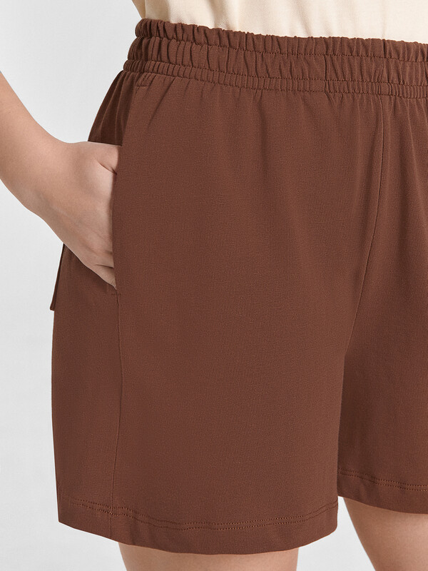 Шорты свободные, короткие. Посадка высокая. Пояс цельнокроеный с эластичной тесьмой внутри (внутр. 40мм, 40RV). В боковых швах обработаны карманы, подкладка из основного полотна. На задней правой половинке накладной карман. Нижние срезы обработаны швом вподгибку.