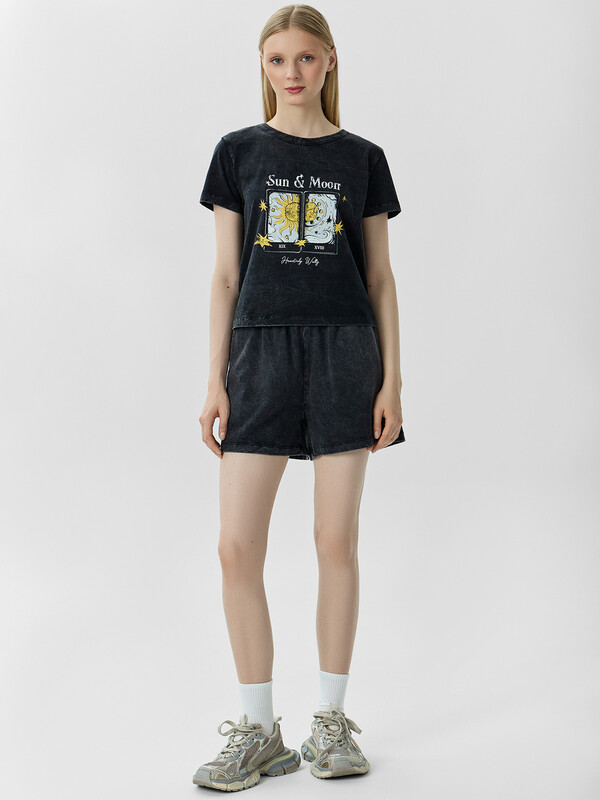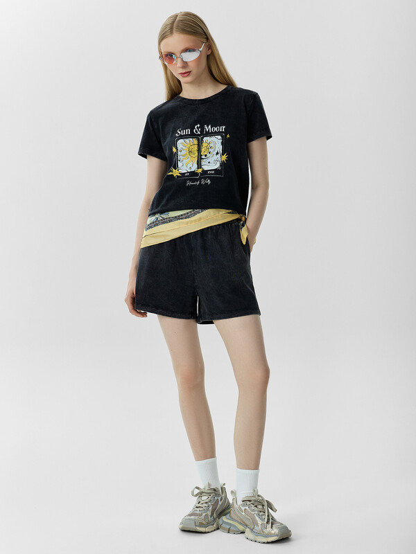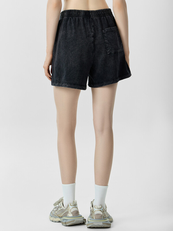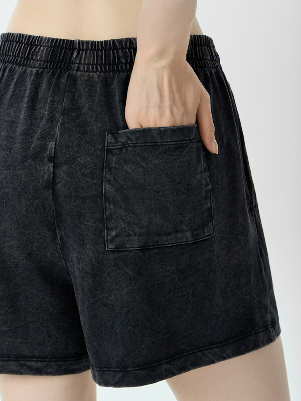 Шорты свободные, короткие. Посадка высокая. Пояс цельнокроеный с эластичной тесьмой внутри (внутр. 40мм, 40RV). В боковых швах обработаны карманы, подкладка из основного полотна. На задней правой половинке накладной карман. Нижние срезы обработаны швом вподгибку.
