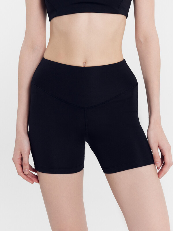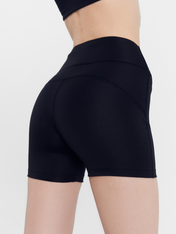 Шорты изготовлены из полотна - Интерлок. Шорты облегающего силуэта с высокой линией талии, короткие. Пояс широкий отрезной фигурный с эластичной тесьмой внутри. Боковой шов перенесен на деталь переда. На задних половинках отрезная фигурная кокетка.