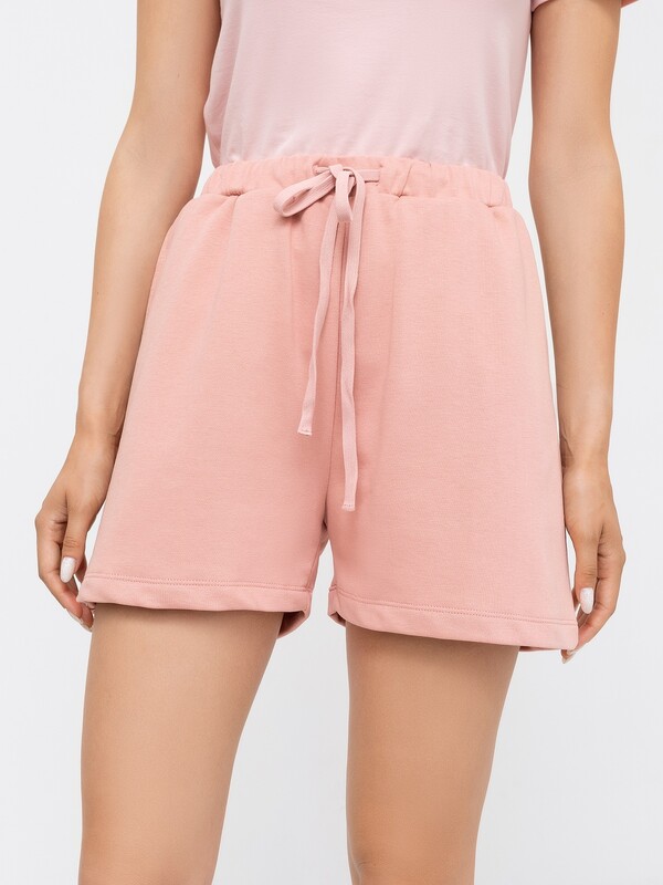 Мини-шорты свободного силуэта из легкого трикотажного футера. Высокая посадка на талии, эластичная тесьма в поясе, регулировочный шнурок-завязка и удобные боковые карманы – комфортный минимализм!