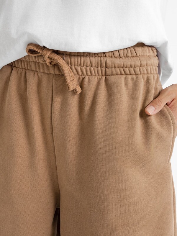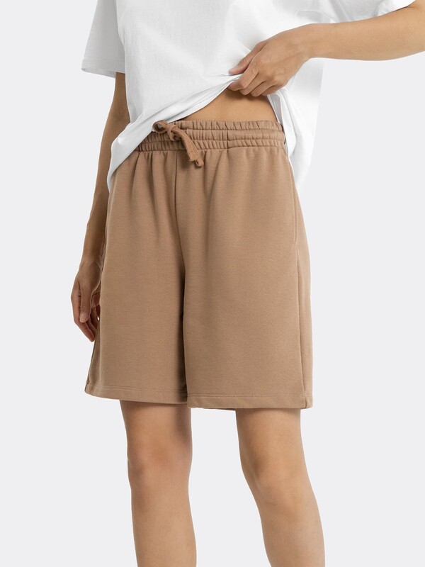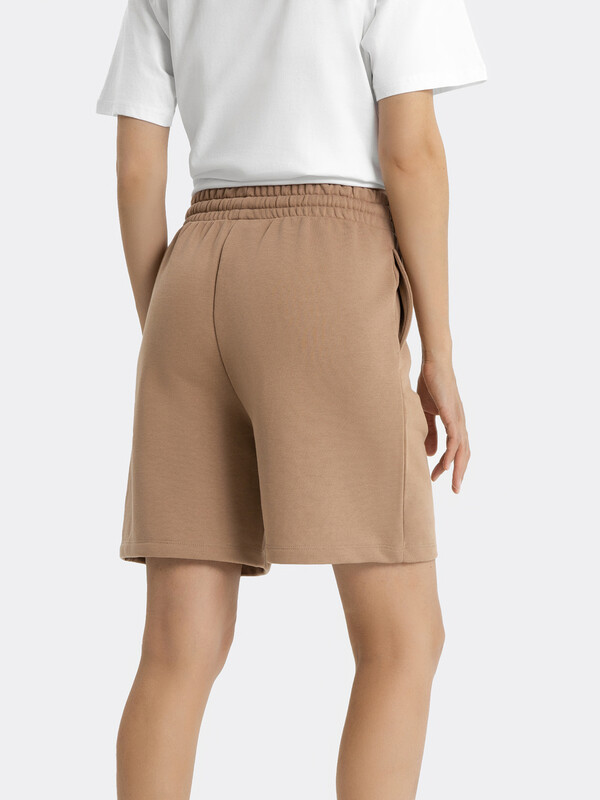 Короткие свободные шорты с высокой линией талии. Изготовлены из трикотажного футера. Пояс – с эластичной тесьмой внутри и шнуром-завязкой. Есть удобные карманы. Стильно!