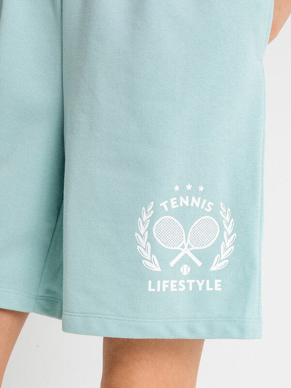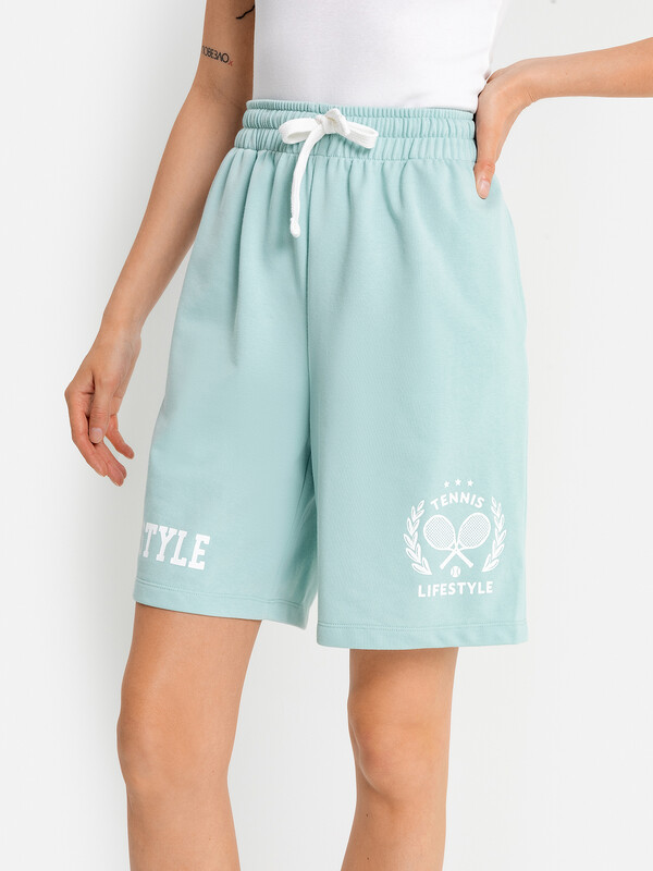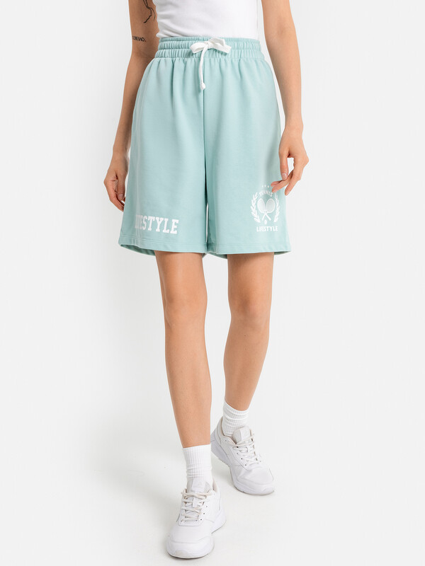 Короткие свободные шорты с высокой линией талии. Изготовлены из трикотажного футера. Пояс – с эластичной тесьмой внутри и шнуром-завязкой. Есть удобные карманы. Стильно!