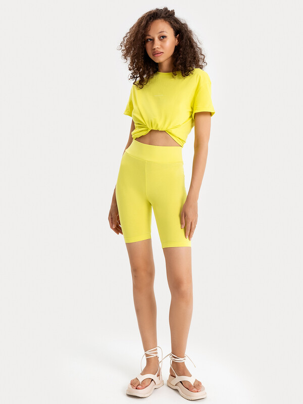 Шорты-велосипедки облегающего силуэта. Выполнены из нежной хлопковой кулирки. Длина модели выше колен. Линия талии завышенная. Широкий отрезной пояс и эластичная тесьма в талии дарят особый комфорт.