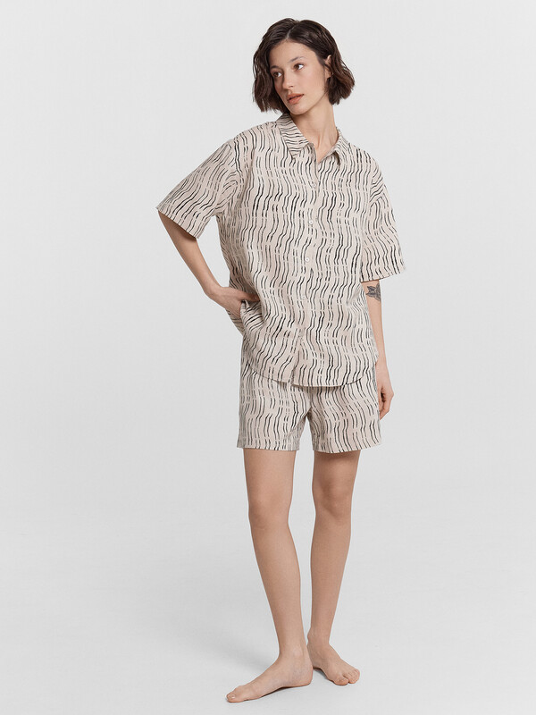Шорты свободного силуэта, короткие. Пояс цельнокроеный, с втаченной эластичной тесьмой 40RV. Низ шорт обработан швом в подгибку.