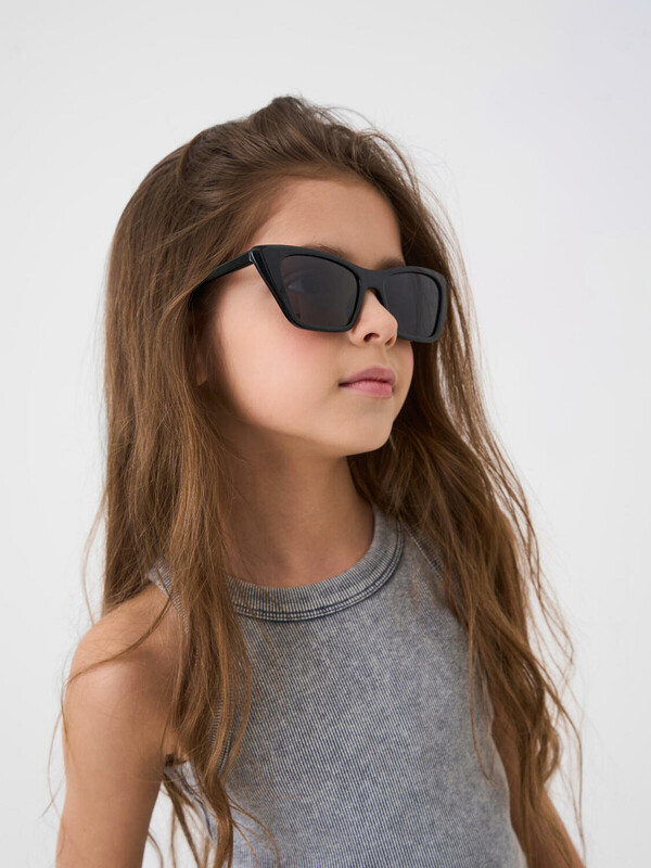 Солнцезащитные очки формы"кошачий глаз" для девочки-подростка. Солнцезащитные очки с фильтром Cat3 и поляризацией. Тёмные линзы имеют защиту UV400, которая отражает 100% ультрафиолетовых лучей с длиной волны менее 400 нанометров, эффективно блокируя все ультрафиолетовые лучи при солнечном свете. Ширина оправы - 145 мм, длина дужек - 146 мм. Обхват головы 54-56 см. Поляризационные фильтры на очках поглощают блики, отражаемые от горизонтальных поверхностей, что помогает повысить четкость зрения и избежать напряжения глаз ребенка. Только при просмотре в линзах с поляризацией видны воздушные шарики в виде сердечек на тест-картинке, вложенной в чехол. Небьющиеся линзы из триацетата целлюлозы устойчивы к царапинам. Такие очки эффективны для защиты глаз в тропиках, у моря и в горах. В комплекте: текстильный чехол, тест-картинка со слониками. Текстильный чехол выполнен из микрофибры и им можно протирать очки. Очки транспортируются в картонной коробке.