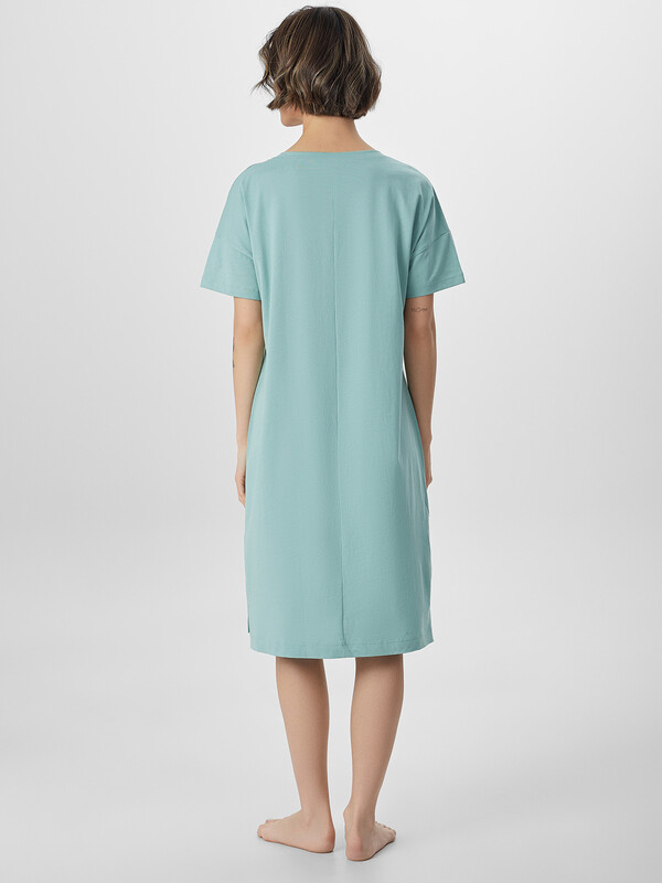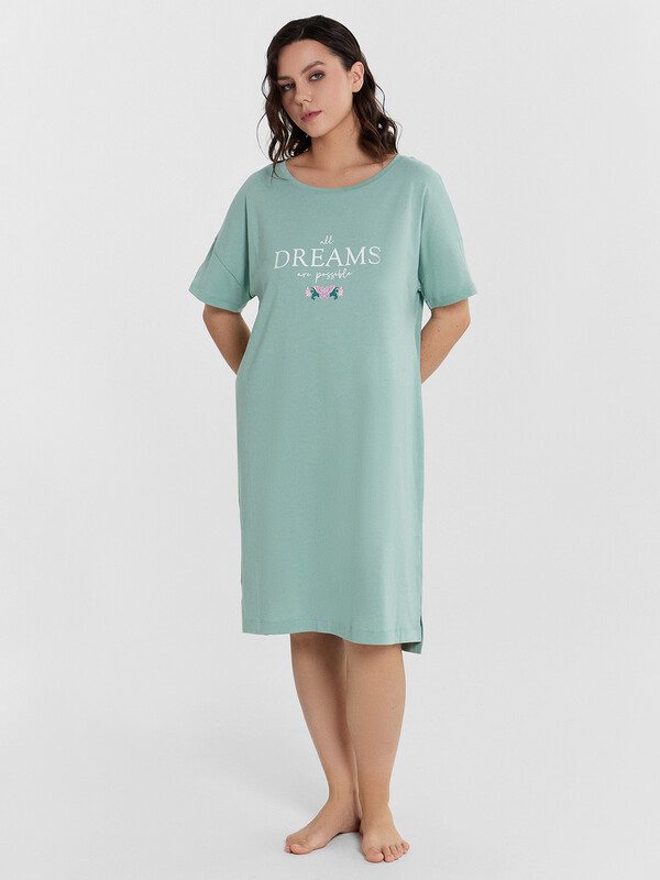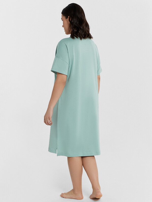 Ночная сорочка из великолепного хлопкового полотна. Силуэт свободный, длина до колена. Короткие рукава, круглый вырез горловины, разрезы по бокам. Привлекательная и уютная модель