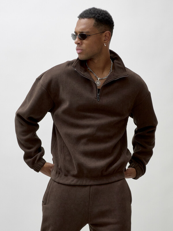 - Худи с отложным воротником: Свободный крой и спущенные плечи делают этот худи невероятно комфортным. Воротник-стойка на молнии не только добавляет стильный акцент, но и защищает от ветра.