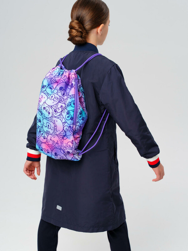Сумка-мешок для сменной обуви из прочной водонепроницаемой ткани для девочки. Мешок для сменки для школьницы с вместительным отделением, затягивающимся двумя шнурками. Дополнительный боковой карман застегивается на молнию. Размер мешка 34*44*2 см. Это отличный вариант для школы и детского садика. В него можно складывать не только сменную обувь, но и спортивную одежду для физкультуры и секций, брать в путешествия. Он легкий и компактный. К мешку для сменки можно подобрать рюкзак и пенал в едином дизайне.
