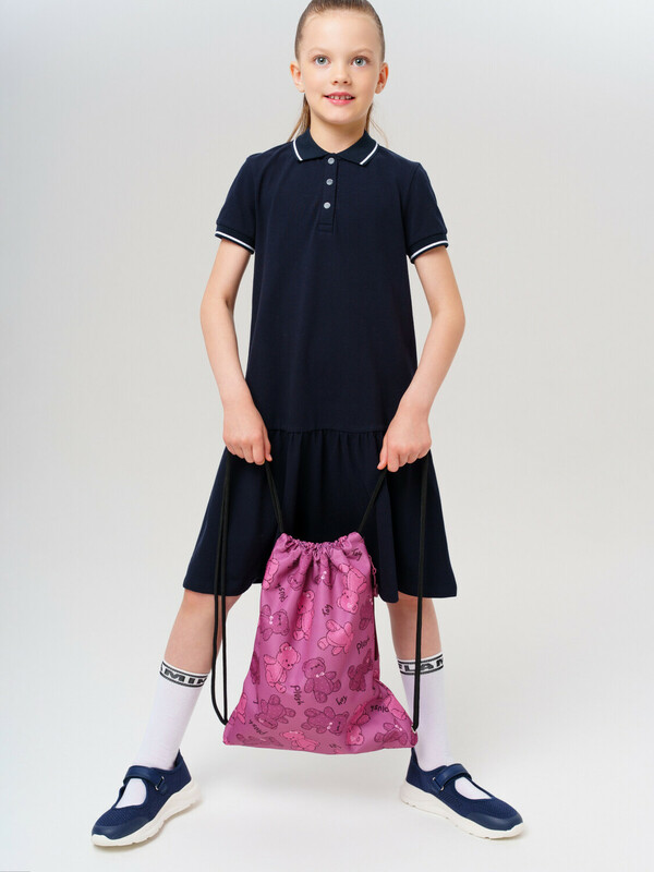 Сумка-мешок для сменной обуви из прочной водонепроницаемой ткани для девочки. Мешок для сменки для школьницы с вместительным отделением, затягивающимся двумя шнурками. Дополнительный боковой карман застегивается на молнию. Размер мешка 34*44*2 см. Это отличный вариант для школы и детского садика. В него можно складывать не только сменную обувь, но и спортивную одежду для физкультуры и секций, брать в путешествия. Он легкий и компактный. К мешку для сменки можно подобрать рюкзак и пенал в едином дизайне.
