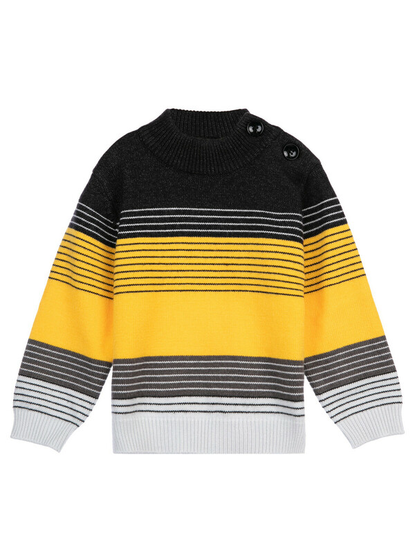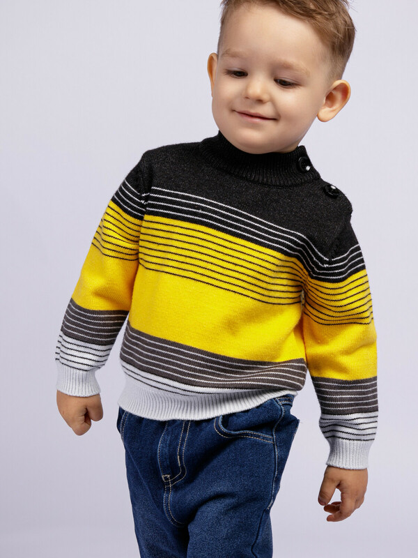 Свитер из вязаного трикотажа. 50% вискоза. Вискоза отличается высокой гигроскопичностью - она впитывает влагу и отлично сохраняет тепло. Воротник, манжеты и низ изделия в рубчик. На плече застежка на пуговицы.