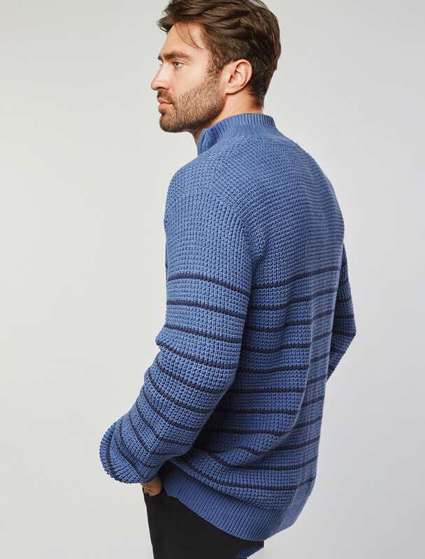 Свитер с узором полосы выполнен из хлопковой пряжи с добавлением акрила. Теплая модель фактурной крупной вязки с воротом, застегивается металлической молнией. Регулируя ворот можно носить с рубашками, футболками и водолазками. Кроме того, свитер совершенно не колется, поэтому его комфортно носить даже на голое тело. Внизу изделия нашивка бренда из эко-кожи.