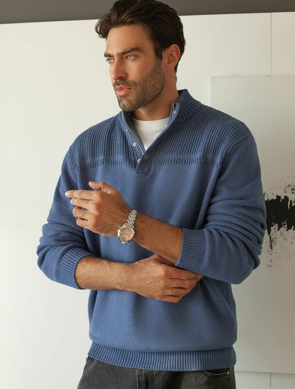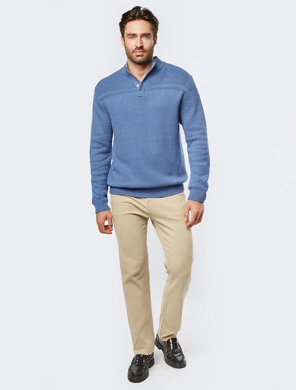Свитер фактурной вязки с застежкой на крупные кнопки выполнен из мягкой хлопковой пряжи с добавлением акрила. Модель из такого материала не препятствует циркуляции воздуха, но при этом хорошо сохраняет тепло и не колется, поэтому ее комфортно носить на голое тело. С помощью кнопок можно регулировать высоту воротника и носить свитер по-разному. Внизу изделия нашивка бренда из эко-кожи.