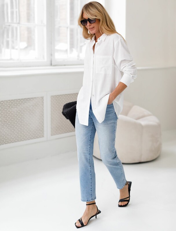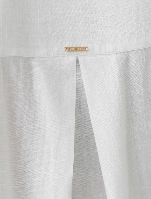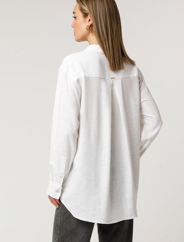 Свободная удлиненная блузка с карманом изо льна с вискозой