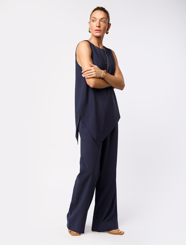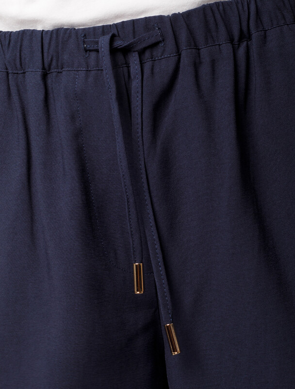 Брюки свободного кроя выполнены из плотного лиоцелла. Модель дополнена карманами и поясом с эластичной резинкой и регулируемым шнурком с золотистой фурнитурой. Ткань изделия отлично держит форму, плавно драпируется и не просвечивает. В теплое время года приятно охлаждает кожу. Добавление синтетических волокон в составе изделия, предотвращает сминаемостьи поддерживает формоустойчивость. Брюки сочетаются в костюме с топом D23.063, блузкой D29.266, D29.267 и жилетом D27.002