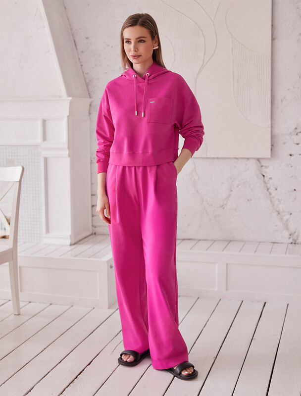 Брюки свободного кроя выполнены из эластичного футера-двухнитки. Модель дополнена защипами и боковыми карманами как у классических брюк и одним задним карманом. Эластичный пояс на резинке с шнурком из репсовой ленты и металлической фурнитурой. Брюки сочетаются в костюме с футболкой D49.031, D49.085, бомбером D49.038 и паркой D49.075