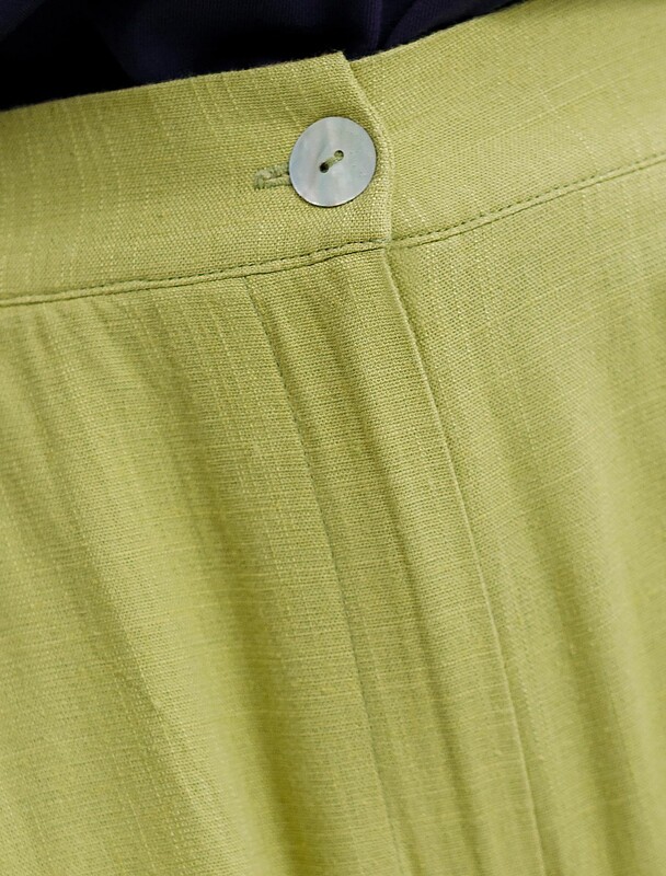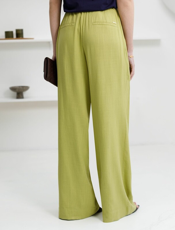 Свободные брюки палаццо салатового цвета изо льна с вискозой, плотностью 200 Г/м2 — выбор, который легко выделит в любой обстановке. Свободные длинные брюки с высокой посадкой создают идеальный силуэт, визуально вытягивают и стройнят фигуру. Натуральный состав ткани обладает высокой воздухопроницаемостью, хорошо драпируется и мягко прилегает к фигуре, создавая струящиеся складки. Мягкая эластичная резинка, встроенная в пояс брюк, обеспечивает идеальную посадку по фигуре, не сдавливая талию и гарантируя максимальный комфорт при движении. В повседневных брюках будет очень комфортно, благодаря правильной регуляции температуры тела. Брюки подходят на маленький  и высокий рост, а так же на любую фигуру, позволяя подчеркнуть достоинства и скрыть возможные недостатки. Летние льняные брюки отлично сочетаются с монохромным верхом для вытягивания силуэта, с ними можно создавать эффектные наряды как на выход, так и для ежедневных рабочих дел или простых прогулок, от делового шика до повседневного кэжуал.