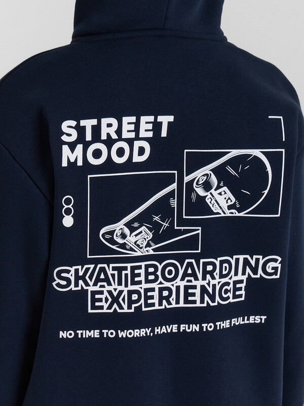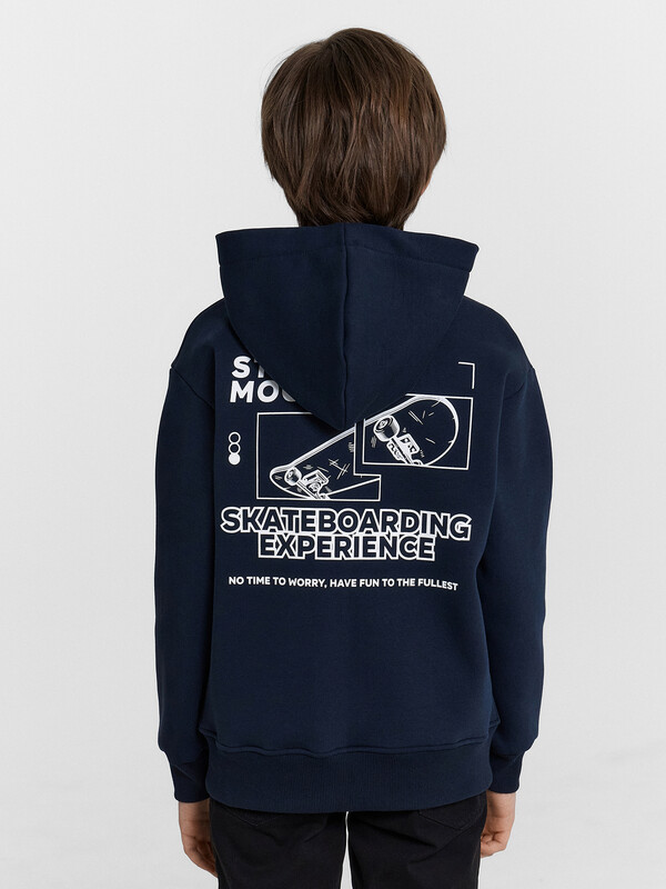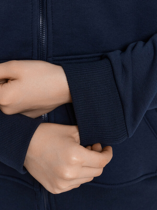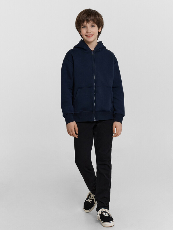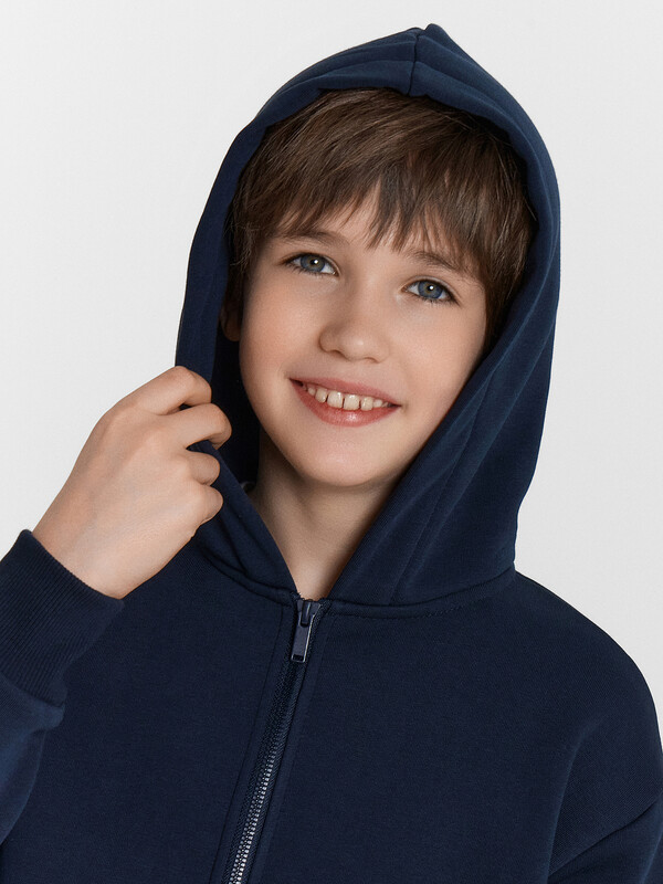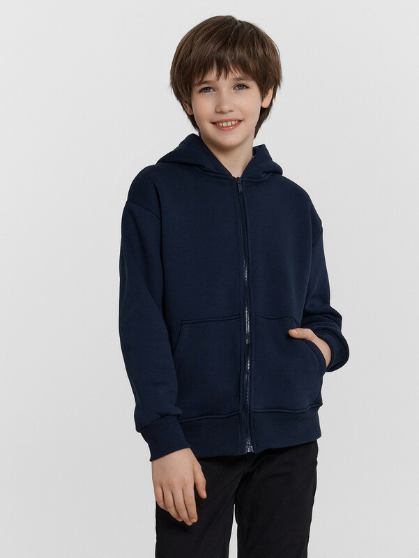 Жакет для мальчиков прямого силуэта с капюшоном. Капюшон на подкладке из основного полотна. Шов втачивания капюшона закрыт х/б тесьмой. Рукава втачные, линия плеча спущена. Притачные манжеты по низу рукавов и притачной пояс из рибаны. По переду застежка молния, карман кенгуру.