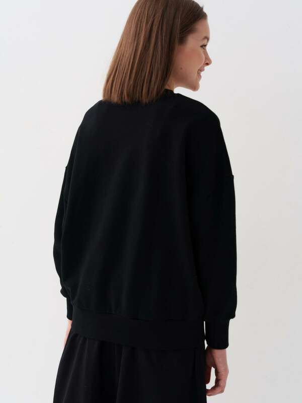 Свитшот оверсайз для девочки подростка. Выполнен из хлопкового футера без начеса. На передней части — нашивка. Низ изделия и рукава оформлены эластичными резинками.